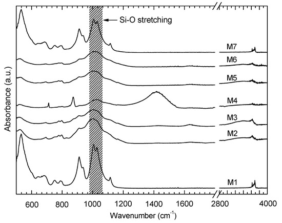 Sample M4 shows additional bands. These are assigned to distinct absorption bands at 1413 cm−1 (CO3 stretching), 712 cm−1 and 875 cm−1 (CO3 deformation) caused by presence of calcite in the sample.