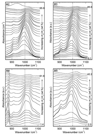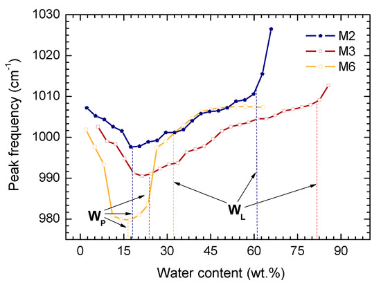 The results shown in Figure 5 make it possible to split the considered range of moisture variation into sub-ranges that are characterized by the same qualitative behavior of the most intensive absorbance of the spectra of analyzed objects. The moisture intervals shown in Figure 5 are determined on the basis of the need to assess the changes in the spectral position of the analyzed Si–O lines in the range up to the values measured by the standard LL methods until the samples are completely saturated with water.