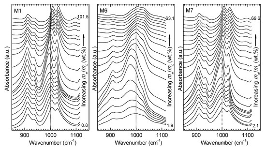 The samples M4, M5 and M6, contain 87%, 57% and 65% of non-clay particles, respectively. The data in Figure 8 show that the concentration of non-clay minerals affects significantly the absolute values of the wavenumbers of the Si–O ν line.