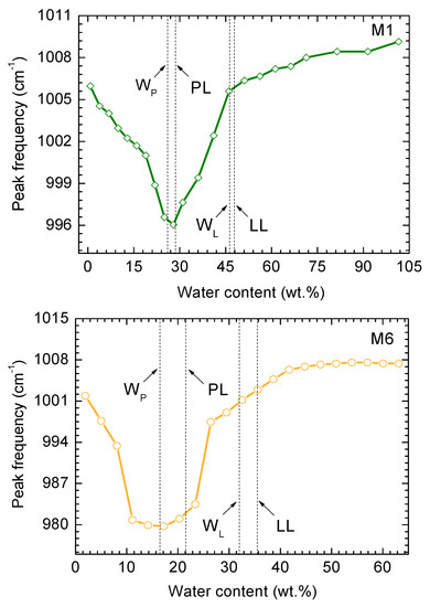 Peak frequency shifts for the Si–O stretching band as a function of water content (moisture) of the kaolinite (M1) and polymineral soil (M6) [48].