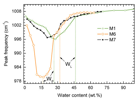 Figure 8 shows the spectral Si–O ν line positions in samples M4, M5 and M6. The last two samples have similar mineralogical compositions, but differ in the concentration of minerals they contain. It is clear that the change of the concentration of clay minerals leads to considerable changes in the character of wavenumber-moisture dependence curves, while moistures at the plastic and liquid limits, according to the traditional measures, change little.