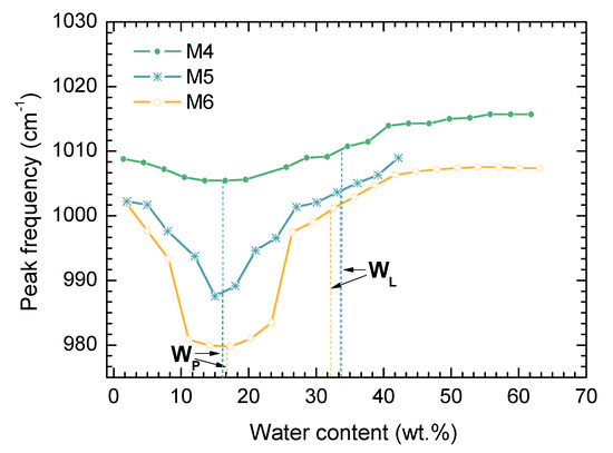Peak frequency shifts for the Si–O stretching band as a function of water content (moisture) of the polymineral soil samples (M4, M5 and M6) with different concentration of clay minerals.