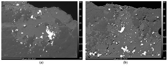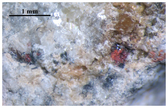 Vorontsovite and ferrovorontsovite occur as black anhedral grains and their segregations embedded in white calcite-dolomite matrix (Figure 1). Individual grains are up to 0.5 mm and 0.2 mm across, respectively, but usually much smaller (average size of both—0.05 mm across); segregations are up to 1 mm (Figure 2a,b).