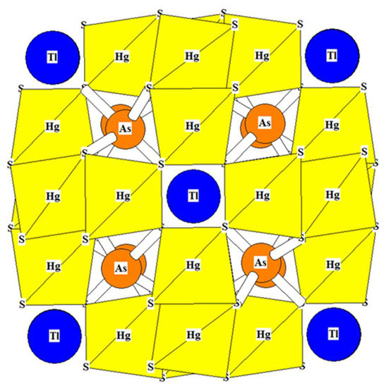 - Divijakovic, V.; Nowacki, W. Die Kristallstruktur von Galchait [Hg0.76(Cu,Zn)0.24]12Tl0.96(AsS3)8. Z. Kristallogr. 1975, 142, 262–270. [Google Scholar]