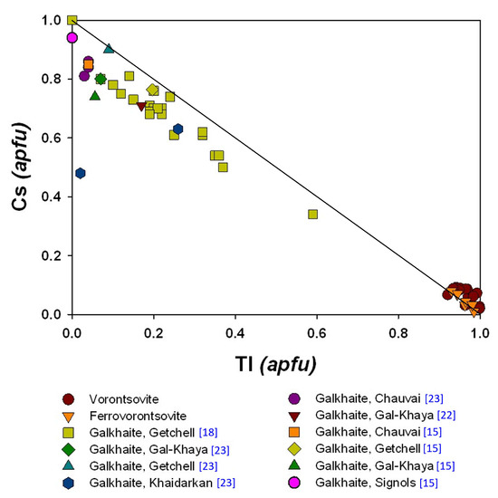 Tl vs. Cs, in apfu, in vorontsovite, ferrovorontsovite (our data), and galkhaite (various literature data obtained from samples from the Getchell mine, Nevada, USA; Gal-Khaya deposit, Sakha Republic, Russia; Khaidarkan deposit, Kyrgyzstan; Chauvai deposit, Kyrgyzstan; and Signols, Piedmont, Italy).
