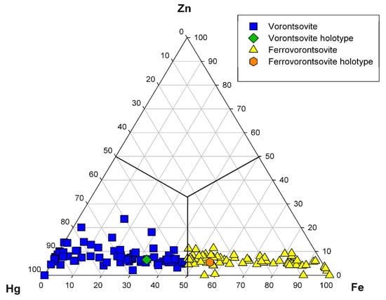 Instead, we recorded, at the Vorontsovskoe deposit, a very large isomorphic substitution of Hg for Fe and partially by Zn in mixed tetrahedral sites leading to a continuous solid solution series from completely Fe–Zn-free vorontsovite, through many intermediates in the Hg/Fe ratio members, including those corresponding to the middle of the series, to the end-member Hg–Zn-free ferrovorontsovite (Figure 5).