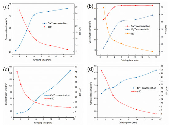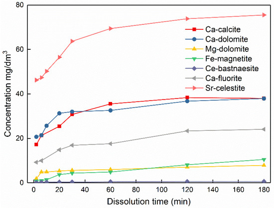 Grinding is an essential process before flotation, and is generally accepted to be able to change ionic environment in flotation pulp [26,27,28]; therefore, the influence of grinding on metal ion release was investigated. As shown in Figure 4, for all the minerals, the concentration of metal ions increased with grinding time, this may be attributed to the reduction of particle size, which increased surface area of particles exposed in solution [26]. As for calcite, dolomite, fluorite, celestite and iron minerals, the concentration of released intrinsic metal ions has been improved significantly, which indicates that the release of metal ions were remarkable enhanced by grinding before flotation. While for bastnaesite, grinding had little influence on the release of Ce3+, even when the particles were ground to d50 = 10.82 μm, the concentration of released Ce3+ was still below 0.9 mg/dm3; therefore, the release of rare earth ions from bastnaesite into flotation pulp could be negligible.