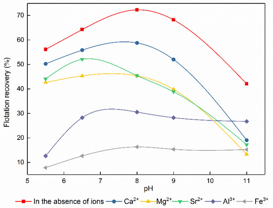 Influence of pH on bastnaesite flotation (Metal ion: 1 × 10−4 mol/dm3, salicylhydroxamic acid (SHA): 5 × 10−4 mol/dm3).