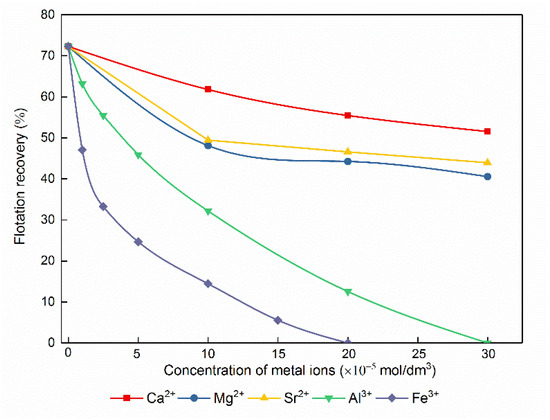 There were abundant and various metal ions in the practical bastnaesite flotation pulp (Table 1). It can be seen from Table 1 that the primary metal ions were divalent alkaline-earth metal ions, Ca2+ had the highest concentration of 32.44 mg/dm3, followed by Mg2+ and Sr2+, with a concentration of 19.71 mg/dm3 and 18.58 mg/dm3, respectively. In addition, Fe3+, K+ and Na+ also presented in the pulp with relatively high concentrations compared with Ba2+, Cu2+, Zn2+, Pb2+ etc. All rare earth ions had low concentrations of below 0.1 mg/dm3.