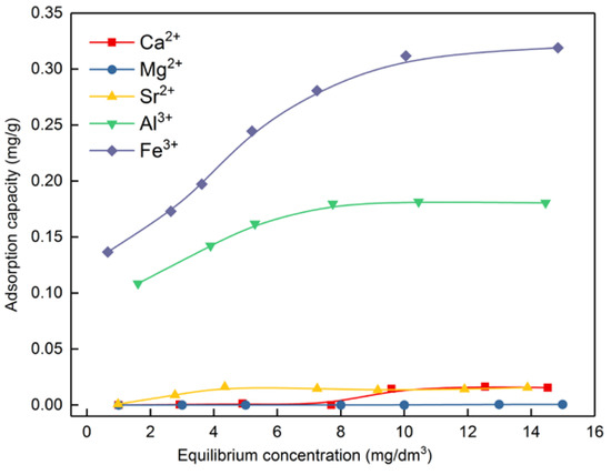 As shown in Figure 8, the saturated adsorption capacity of Fe3+ was much higher than that of other metal ions, reaching 0.32 mg/g at 20 °C, followed by Al3+, reaching a saturated adsorption capacity of 0.18 mg/g, while the adsorption capacity of Ca2+, Mg2 and Sr2+ was much lower in comparison with that of Al3+ and Fe3+. The results of adsorption capacity experiments were consistent with flotation and induction time measurement results, indicating the influence of metal ions on bastnaesite flotation was related to metal ion adsorption on bastnaesite surfaces. It should be noted that Ca2+ and Mg2+ could hardly be adsorbed on bastnaesite surfaces; however, they still exerted slight depression effects, and this may be attributed to the consumption of collector in solution by metal ions.