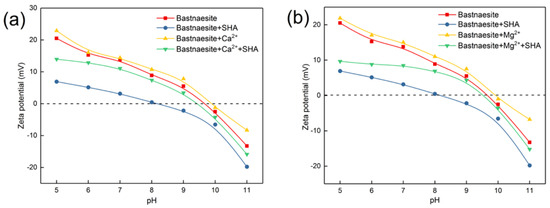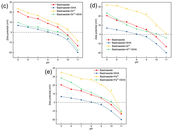 Zeta potential of bastnaesite treated and not treated with (a) Ca2+; (b) Mg2+; (c) Sr2+; (d) Al3+; (e) Fe3+ as a function of pH in the absence and presence of pH.