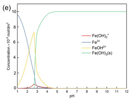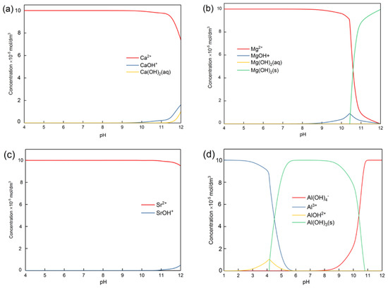 Distribution diagrams of (a) Ca2+; (b) Mg2+; (c) Sr2+; (d) Al3+; (e) Fe3+ as a function of pH (1 × 10−4 mol/dm3).