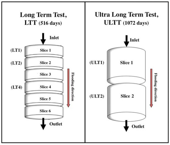 Schematic drawings of how the two cores were cut after the flooding experiment: Long Term Test (LTT) to the left (modified from Zimmermann et al., 2015 [36]) and Ultra Long Term Test to the right.