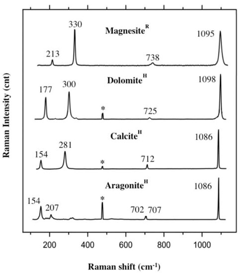 Raman spectra of calcium and magnesium carbonates: magnesite (Micro-Analysis Consultants certificated standard), dolomite (UNIMIB standard sample, Selvino, Italy), calcite (UNIMIB standard sample, Chihuahua, Mexico, ~0 mol % MgCO3), and aragonite (UNIMIB—University of Milano Bicocca—standard sample, Val Formazza, Italy). Spectra with “R” were analyzed by the Renishaw inVia confocal Raman microscope and spectra with “H” by Horiba Xplora. Stars represent the neon lamp emission line at 476.8 cm−1 used for calibration with the Horiba XploRA spectrometer. Peak positions are reported without decimals.