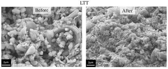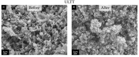 Various high-resolution methods were used to study mineralogical alteration in flooded chalk: field emission gun scanning electron microscopy, energy-dispersive X-ray spectroscopy (FEG-SEM-EDS) [3,5,8,14,36,37,53], nano secondary ion mass spectrometry (NanoSIMS) [36,47,54], X-ray diffraction (XRD) [36], whole-rock geochemistry techniques [21,36]. Tip-Enhanced Raman Spectroscopy-Atomic Force Microscopy (TERS-AFM) [55,56], Transmission Electron Microscopy (TEM) [53,57], and Mineral Liberation Analysis (MLA) [53]. The authors (Zimmermann et al., 2015 for the LTT, and Nermoen et al., 2015 for the ULTT) determined a loss of Ca2+ and a gain in Mg2+, demonstrating a precipitation of new Mg-minerals in the core. FEG-SEM and TEM images have shown magnesite crystals with a grain size between 100 nm and 1 µm [53,57].