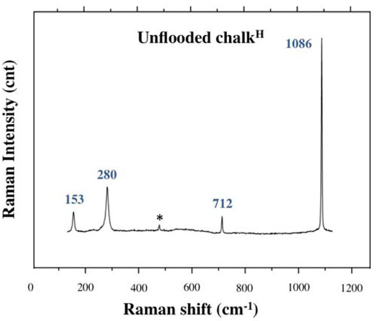 Raman spectrum collected on an unflooded Liège chalk core. Calcite is the only mineral detected, and its peaks are reported in blue/bold. The spectrum was collected with the Horiba XploRA spectrometer; the star represents the neon lamp emission line at 476.8 cm−1 used for calibration with the Horiba XploRA spectrometer. Peak positions are reported without decimals.
