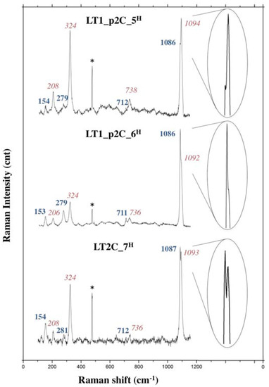 Raman spectra showing magnesite and calcite peaks in the same spectrum. This happen when grains of 1–2 μm in size and different mineralogy are overlapped or placed very close: the laser beams both grains at the same time, and, as a consequence, the instrumentation detects the vibrational modes of both minerals. In LT1_p2C_5, the signal from magnesite is stronger than the calcite one; in LT1_p2C_6 it is weaker. The main peaks (ν1, symmetric stretching mode of the carbonate ion) of the two minerals are very close, generating a high peak with a “shoulder”. In the third example shown, LT2C_7, the ν1 of the two grains is so sharp and strong that a double peak is present. Calcite peaks are reported in blue/bold, magnesite peaks in red/italic. All the spectra were collected with the Horiba XploRA spectrometer; stars represent the neon lamp emission line at 476.8 cm−1 used for calibration. Peak positions are reported without decimals.
