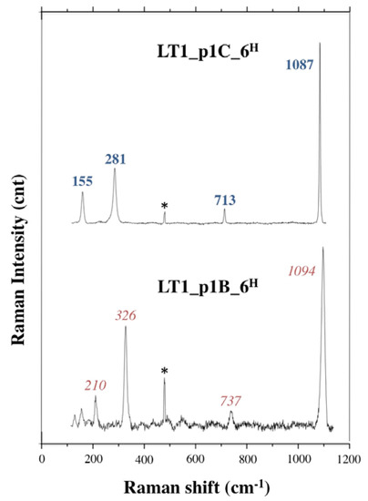 Raman spectra collected on the first slice of the Long Term Test. Raman showing the occurrence of the original calcite (LT1_p1C_6) and the presence of recrystallized magnesite (LT1_p1B_6). Calcite peaks are reported in blue/bold, magnesite peaks in red/italic. All the spectra were collected with the Horiba XploRA spectrometer; stars represent the neon lamp emission line at 476.8 cm−1 used for calibration with the Horiba XploRA spectrometer. Peak positions are reported without decimals.