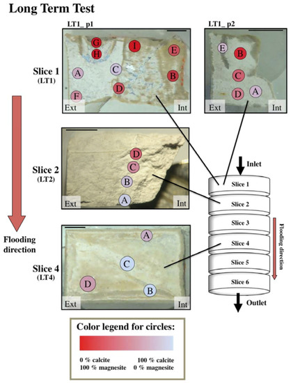 In Slice 4 (LT4; LTT), the recrystallization is less pervasive in the core than in the others (LT1 and LT2, LTT), as is the furthest from the inlet surface (Table 1; Figure 7). A diagonal deep and pale grey structure crosses the LT4 slice (see Figure 7) with a pure calcitic composition (111 spectra, 100% of CaCO3 no magnesite spectra were detected in this area). Some MgCO3 spectra have been collected in a brownish area near the rim of the core (23% of magnesite).