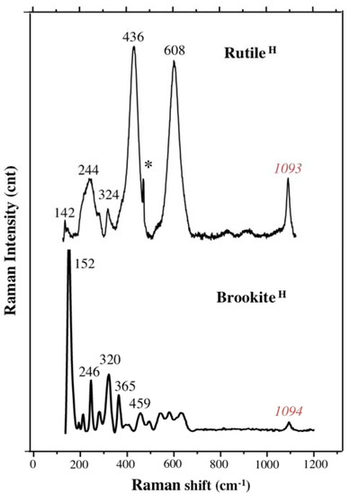 A brookite spectrum (identified in LT1_p1G) and one for rutile as identified in LT2_D (see Table 1). The main peak of magnesite (labelled in red) is present in both of them at 1093 and 1094 cm−1, since the two minerals are surrounded by carbonates, which have a strong signal. Both spectra were collected with the Horiba Xplora spectrometer; the star represents the neon lamp emission line at 476.8 cm−1 used for calibration. Peak positions are reported without decimals.