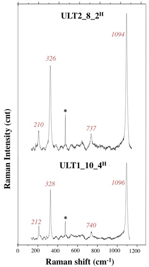 During this study, most of the spectra (465 of 557; reported with “H” in Figure 2) were collected with a Horiba XploRA Raman spectrometer (Kyoto, Japan) equipped with an Olympus microscope (Tokyo, Japan) with maximum magnification of 100×, and a motorized x–y stage. Calibration of spectra was obtained using a silicon wafer with a main peak at 520.7 cm−1 as reference and maintained during the analysis with a constant checking of the position of a sharp neon lamp emission line at 476.8 cm−1. Other spectra (92 of 557; LTT slice 1: p1_G and I; p2_D and E; slice 4: C and D; reported with “R” in Figure 2) were obtained using a high-resolution Renishaw inVia Reflex confocal Raman microscope, equipped with a Leica DM2500 polarizing microscope (Wetzlar, Germany) (maximum magnification of 100×) and motorized x–y stages. With both spectrometers, spectra were collected with a 532 nm line, solid-state lasers (10 mW at the sample); laser spot; and x, y, z spatial resolution around 1 μm with 100× enlargement, spectral resolution of ±1 cm−1, and acquisition time of 1–2 min. Microscope pictures were taken for each beamed grain or cluster of grains. The spectral region found to be the most important and convenient to our study was the low-medium one; setting the XploRA spectrometer with a 2400 lines/mm grating in back-scattering configuration allowed us to collect in the spectral range 100–1200 cm−1. Using a grating of 1800 lines/mm with the inVia spectrometer instead allowed us to collect in the range of 140–1900 cm−1. In order to try to detect the occurrence of hydrated silicates, the region between 2900 and 4200 cm−1 was investigated, collecting 200 spectra with the Renishaw inVia Reflex confocal Raman microscope at 100× of magnification.
