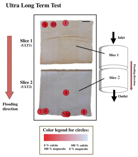 Mineralogical composition of the LTT core: 10 to 70 spectra have been collected in each of the area shown (9 areas in LT1_p1, 4 in LT1_p2, 4 in LT2, and 4 in LT4). Color legend reflects the percentage of calcite and magnesite spectra collected in each area of the sample. See Table 1 for calcite and magnesite amounts and percentages obtained for each area. Flooding direction is indicated. Inner (core) end external (rim), parts of the samples are marked. The scales represent 0.25 cm. A schematic drawing (modified from Zimmermann et al., 2015 [36]) of how the cores were cut after the flooding experiment is shown to the right.