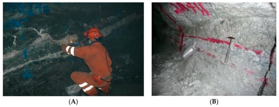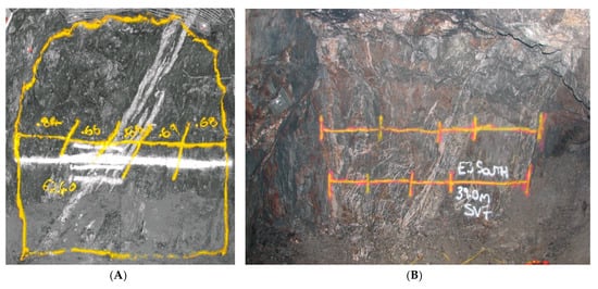 Face photographs showing sample lines based on geology: (A) A single chip sample line divided into a central vein sample with associated hanging and footwall samples; (B) Dual face chip sample lines across a sheeted vein zone.