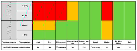 Gold deposits often pose challenges during sampling because of their apparently erratic grade distribution. Consideration should be given to the nature of the ore with respect to in-situ gold particle sizing and distribution; the partition of gold between sulphide-locked and free categories; geological versus assay cut-offs; and stringers/disseminations that require sampling beyond vein margins. Coarse gold-bearing mineralisation is generally characterised by a high geological or in-situ nugget effect and prone to high sampling nugget effect if sampling activities are not optimised [13,14]. Gold particles greater than 100 µm in size are generally considered to be coarse, where very coarse gold is greater than 2000 µm in size.