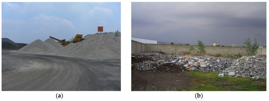(a) Mounds of recycled gravel at the Concretos Reciclados S.A. plant; (b) a landfill containing construction and demolition waste (CDW) where the demolished concrete was collected.