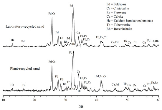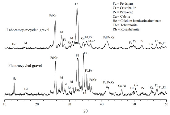 Figure 5 and Figure 6 illustrate the XRD results from the gravels and sands recycled in the laboratory and in the industrial plant. All of these patterns are very similar to each other, showing peaks and reflection overlapping typical of multiphase mixtures.