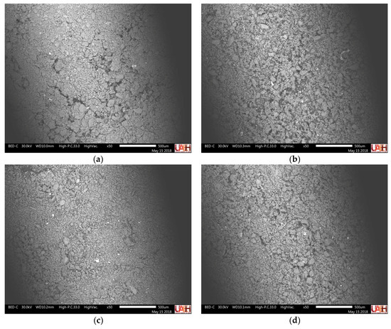Figure 7 shows SEM images of scanned areas in the EDS analysis; these micrographs do not provide information on the morphology of the samples of recycled aggregates, because the particles have very small dimensions (<75 μ) that are only observed at high magnification. However, the images reveal a uniform distribution of the fine powders, a necessary condition for a representative analysis of the samples.