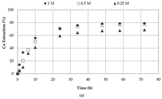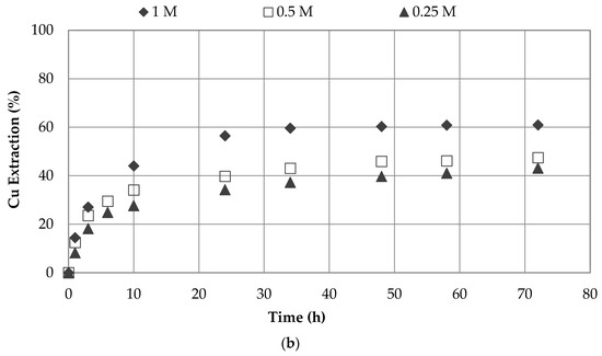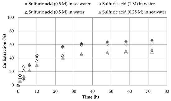 Figure 4a,b show the influence of sulfuric acid concentration. The highest copper extraction rate was obtained at higher concentrations of acid in seawater and water systems. The results indicate that the oxidation power of nitrate ions increases with increased in sulfuric acid concentrations. This observation is in good agreement with the findings of Sokić et al. [28]. In this study, copper extraction increased by 50% and 45% when the sulfuric acid concentration increased from 0.25 to 1.0 M in seawater and water systems, respectively.