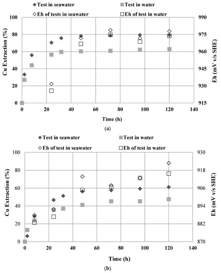 Values of redox potential (mV) against time (h) for the systems: (a) H2SO4 (1 M), NaNO3 (1 M) in seawater and water and (b) H2SO4 (0.5 M), NaNO3 (0.5 M) in seawater and water. Experimental conditions: 5 days of leaching and 45 °C.