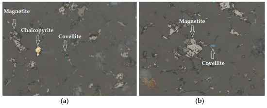 The residue characterization (test 11) confirms that chalcopyrite was significantly leached in the seawater media. Covellite was found in small quantities, 1% and 3%, in the solid residues of the leaching test in the seawater and water media, respectively (Figure 9). It is supposed that covellite in the solid residue is formed as an intermediate product during chalcopyrite dissolution.