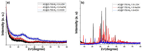 It is known that when a substance is dissolved in water or some other solvent, its crystal structure is destroyed. That means that in the first stage of obtaining samples for this study, during the preparation of a 1 mol/dm3 solution of glucose or fructose, their crystalline structures were destroyed. Then, it is also known from the literature [47,48] that because of HTC treatment, an amorphous network with a high content of carbon is obtained with increased surface functional properties so it may be said that HTC-obtained carbon containing materials from glucose and fructose do not possess crystal structures. It was of interest to determine whether additional activation with different hydroxides had an influence on crystalline structures of prepared carbonaceous materials, i.e., whether activation takes place in the same way on both sugars. For that reason, XRPD analyses of samples AC@G–T–N2–t–XOH and AC@F–T–N2–t–XOH were performed and the results are shown in Figure 2.
