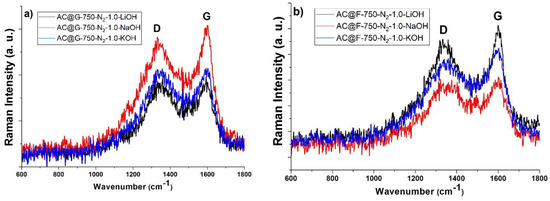 The Raman spectra of activated carbons: (a) AC@G–T–N2–t–XOH and (b) AC@F–T–N2–t–XOH.