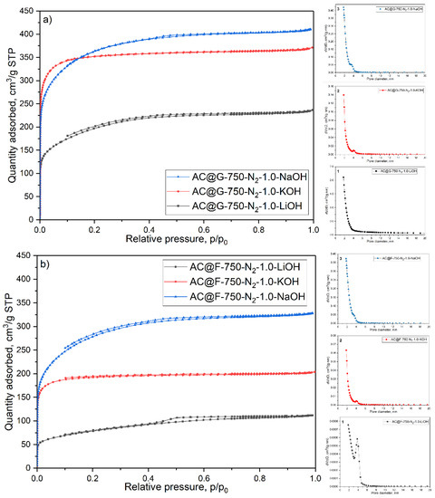 Presented results showed that the content of organic carbon in samples obtained from glucose was higher in comparison with those obtained from fructose after activation with the same hydroxide. For example, after activation with LiOH, the content of carbon was ~62% for AC@G–750–N2–1.0–LiOH and ~38% for AC@F–750–N2–1.0–LiOH. Also, for both sample types (glucose and fructose), the content of organic carbon was much higher after activation with NaOH and KOH in comparison with samples obtained by activation with LiOH. That may be explained as a consequence of the formation of crystal layers after activation which are reach with carbonates and oxides, whereby this phenomenon is the most pronounced for fructose and LiOH activated samples, while the least pronouncing was obtained for KOH activated samples. That is also confirmed by XRPD and Raman spectrometry and is described in Section 3.1.1. Variation in oxygen and hydrogen contents may be explained with formation of the oxides and releasing of the water molecules during activation reactions or due to carbonization as well as decomposition of oxygen-containing functional groups at a high temperature [56,57,58], while presence of insignificant amounts of nitrogen can be a consequence of lagging of nitrogen which was used as an inert atmosphere for obtaining investigated samples.