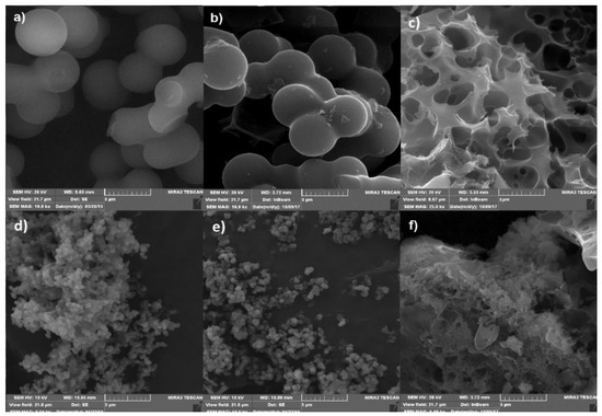 In order to explain and realize differences in morphological properties which occur due to activation by various hydroxides, SEM analyses of samples were performed and results are presented in Figure 5a–c for glucose, and Figure 5d–f for fructose samples activated with different hydroxides. Obtained results were also compared with the results of SEM analyses of the samples (results are not shown) after hydrothermal treatment of glucose and fructose, where it was visible that microspheres, which are the typical morphologies of carbohydrate-derived chars, were developed after hydrothermal treatment.