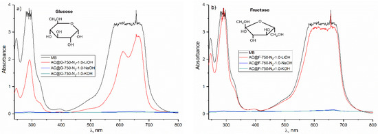 As it can be seen from absorption spectra (Figure 6), the intensity of the characteristic bands for MB significantly decreased after treating of the solutions with glucose (Figure 6a) and fructose (Figure 6b) samples activated with NaOH and KOH, indicating that significant amount of MB was removed from solutions after 24 h. However, samples activated with LiOH showed very low adsorption of MB. From that reason, LiOH activated samples were not further considered. Significant lower adsorption obtained by samples activated with LiOH may be consequence of very low mesopore specific surface area. Similar dependence between mesopores specific surface and MB removal have shown by other authors [59] for adsorption of MB on activated carbon prepared from Tamarind Seeds by activation with KOH, as well as, with results published by Kim et al. [64] for organic dyes removal on hierarchical nanoporous MnO.