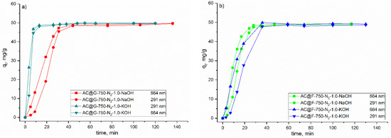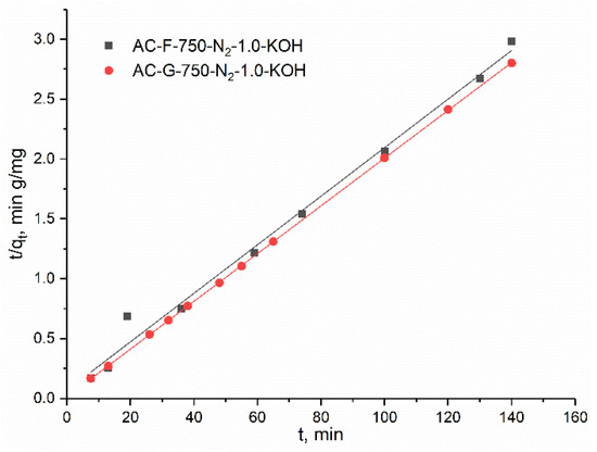 From results presented in Figure 8 and Table 7, good fitting, high values of R2 and good agreement of experimental and calculated values of qe were obtained, meaning that the Pseudo II order model effectively described the kinetic of removal of the MB from aqueous solutions using KOH activated samples obtained from glucose and fructose. Both, initial rate (h) as well as rate constant (k2), were much higher for removal MB by AC@G–750–N2–1.0–KOH, indicating much favorable adsorption of MB than on AC@F–750–N2–1.0–KOH. The reason for that trend may be higher values of the specific surface (SBET and Smeso) as well as greater availability of the active centers for glucose in comparison with fructose sample.
