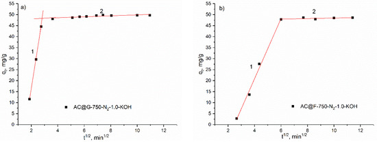 As may be seen from Figure 9, for both adsorbents, curves do not pass through zero and are not linear in all time intervals, which means that different processes are included in MB removal. The largest part of the MB was removed in the first time interval (1) where the highest values of the kD were determined (~38 and ~14 mg/(g·min1/2), for AC@G–750–N2–1.0–KOH and AC@F–750–N2–1.0–KOH, respectively), meaning that MB was mainly removed by processes which include migrating the MB from the solution to the surface of the adsorbents, forming film on the surfaces and adsorption at appropriate active centers on the surfaces. Very low slopes and kD values obtained for both adsorbents in second time interval indicate that a very small amount of the MB was removed from solution by diffusion into internal channels and vacancies. Since that almost all amounts of MB were removed from the solution by processes which occur on the surface of the adsorbents, it can be concluded that these processes are the most responsible for the overall reaction rate and diffusion through the internal channels and the vacancies does not significantly affect the entire process. Similar conclusions were made by other authors for removal of methylene blue by mango seed kernel powder [68] or by activated carbon developed from Ficus carica bast [38].