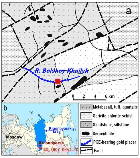 Regional geology of the Bolshoy Khailyk area (a) based on [6], with minor modifications, and a map (b) showing the location of the placer area in the Russian Federation. The red square (a) shows the sampling area (this study).
