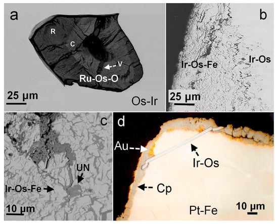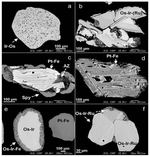 Many of placer grains of Os–Ir–Ru and Pt–Fe alloys have a porous (Figure 3e), abundantly fractured or altered rim (Figure 6b,c), associated with the development of secondary phases of PGE sulfide, arsenide, sulfarsenide, native gold and a Pt–Ir–Ni-rich alloy. Such zones of metasomatic alteration (labeled AZ: Figure 3c and Figure 5b) are developed close to grain margins; they are isolated and surrounded by an outer rim of sperrylite. The rare compounds formed in these zones include Cu-rich bowieite and a Se-rich sulfarsenide of Pt (Figure 5b).
