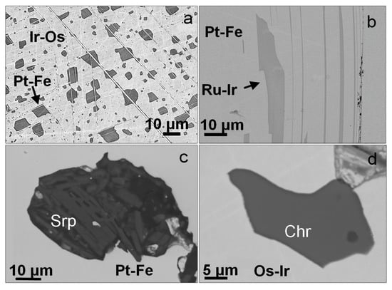 (a) BSE image showing exsolution phases of Pt–Fe alloy hosted by a grain of Ir–Os alloy. Note the presence of an Or–Ir alloy of late generation, cutting the exsolution lamellae of Pt–Fe alloy; this late alloy filled the cleavage space at a subsolidus stage. (b) BSE image of lamellar inclusions of a Ru-dominant alloy, labeled Ru–Ir, which has the composition [Ru65.6Ir12.5Os9.6Rh6.7Pt5.7], and is hosted by an isoferroplatinum-type alloy of Pt–Fe: [Pt63.4Fe24.8Rh6.0Cu3.6Pd2.2]. (c) BSE image of inclusion of serpentine (Srp) hosted by a Pt–Fe alloy, [Pt68.6Fe23.9Cu3.7Pd2.8Rh1.0]. (d) Inclusion of a chromian spinel, labeled Chr, which corresponds to magnesiochromite, and is hosted by a placer grain of Os–Ir alloy [Os45.0Ir39.7Ru15.3]; BSE image.
