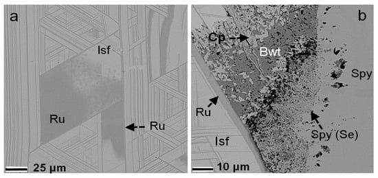 The zoned grain of PGE–Fe oxide could form by combined oxidation and desulfurization of zoned grains of Ru–Os disulfide of the laurite-erlichmanite series. As noted, the observed zonal texture (Figure 6a) is likely a reflection of primary compositional zoning with respect to Ru–Os–(Ir), which is common in grains of laurite–erlichmanite worldwide. The likely schematic reaction at Bolshoy Khailyk is: [6RuS2 + Fe2O3 + 18O2 → Ru6Fe2O15 + 12SO2], which involves a hematite component introduced by an oxidizing fluid phase.