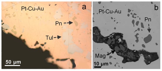 (a) Optical photograph showing inclusions of the tulameenite–ferronickelplatinum series (Tul) and of pentlandite (Pn), which are hosted by a placer grain of Pt–Au–Cu alloy. (b) BSE image of subhedral inclusions of Co–Rh-rich pentlandite (Pn) enclosed within the Pt–Au–Cu alloy. Mag is magnetite.