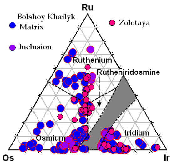 We document the existence at Bolshoy Khailyk of extensive fields of solid solution in the system Os–Ru–Ir (Figure 8). The general enrichment in Ru is recognized in the coexisting pairs of matrix and exsolution-induced inclusions. As shown for comparison in Figure 8, the Os–Ir–Ru alloy grains from the neighboring placer at the River Zolotaya [5] also display the characteristic pattern of enrichment in Ru.