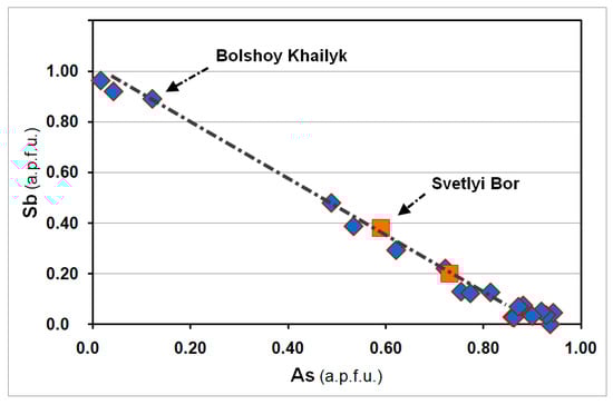 Members of the tolovkite (IrSbS)—irarsite (IrAsS)—hollingworthite (RhAsS) solid solution form inclusions (≤20 μm) enclosed within the Pt–Au–Cu alloy. The observed existence of Sb-for-As substitution is especially noteworthy (Figure 9, Table 5), as it was also documented in related PGM from the Svetlyi Bor complex (Svetloborskiy) of the Urals: (Ir0.91Rh0.08Fe0.02)Σ1.01(As0.59Sb0.38)Σ0.97S1.02 and (Ir1.01Rh0.03Fe0.03)Σ1.07(As0.73Sb0.20)Σ0.93S1.00 [16]. Tolovkite from its type locality, the alluvial placers of the Tolovka River zone associated with the Alpine-type Ust’-Belskiy complex, Magadanskaya oblast, Russia, is close to its end-member composition, IrSbS [17]. Another series of solid solution extends from IrSbS (tolovkite) toward its Rh counterpart, unnamed RhSbS [18]. Note that some compositions are Pt-rich (#16, Table 5), thus suggesting that the platarsite component (PtAsS [19]) also is involved.