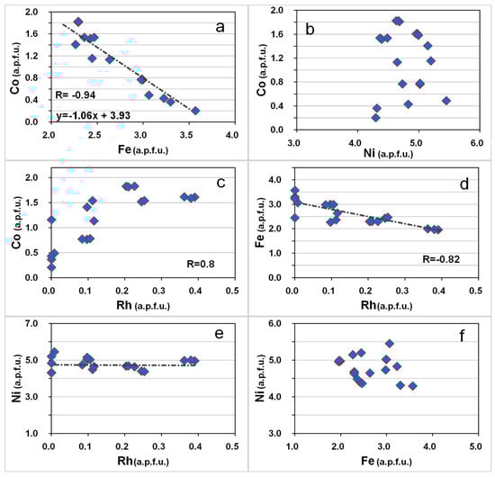 Variations and correlations observed in compositions of Rh–Co-rich pentlandite from the Bolshoy Khailyk placer in terms of binary plots Co vs. Fe (a), Co vs. Ni (b), Co vs. Rh (c), Fe vs. Rh (d), Ni vs. Rh (e), and Ni vs. Fe (f), with values expressed in values of atoms per formula unit, a.p.f.u., calculated for a total of 17 a.p.f.u. Values of the correlation coefficient R are shown, along with an equation of linear regression in (a).