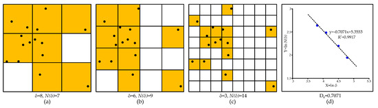 Schematic diagram of box-counting analysis: (a) 7 boxes containing target points with box size δ = 8; (b) 9 boxes counted with box size δ = 6; (c) 14 boxes counted with box size δ = 3; and (d) log-log plot revealing the power-law relationship of counted box number N(δ) and box size δ, obtaining box-counting fractal dimension DB = 0.7071.